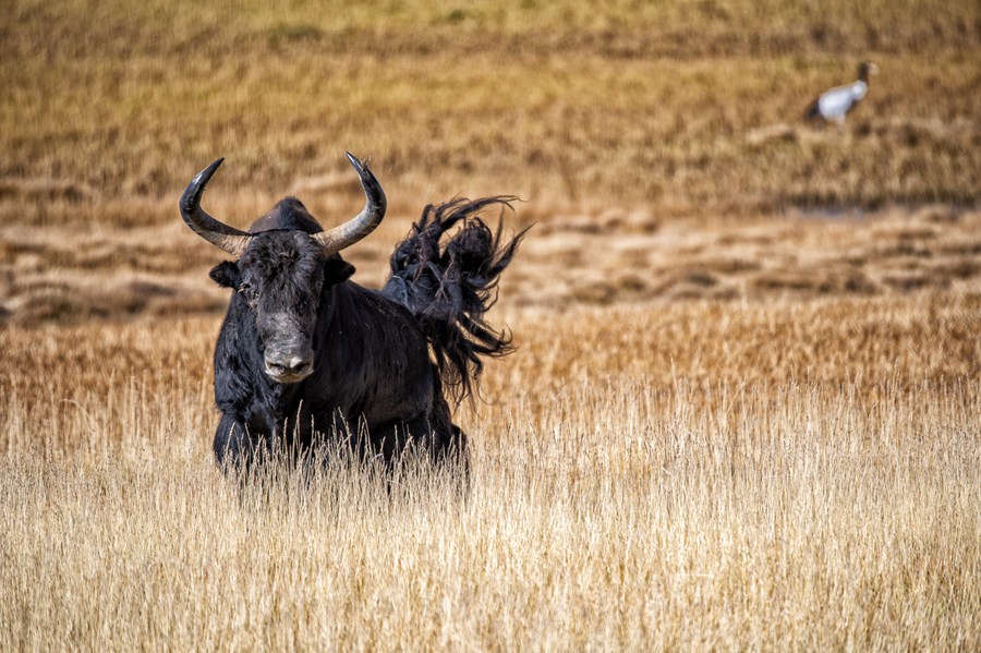 This photo taken on Oct. 14, 2023 shows a wild yak at the Altun Mountains National Nature Reserve in northwest China's Xinjiang Uygur Autonomous Region. (Photo by Shang Peng/Xinhua)