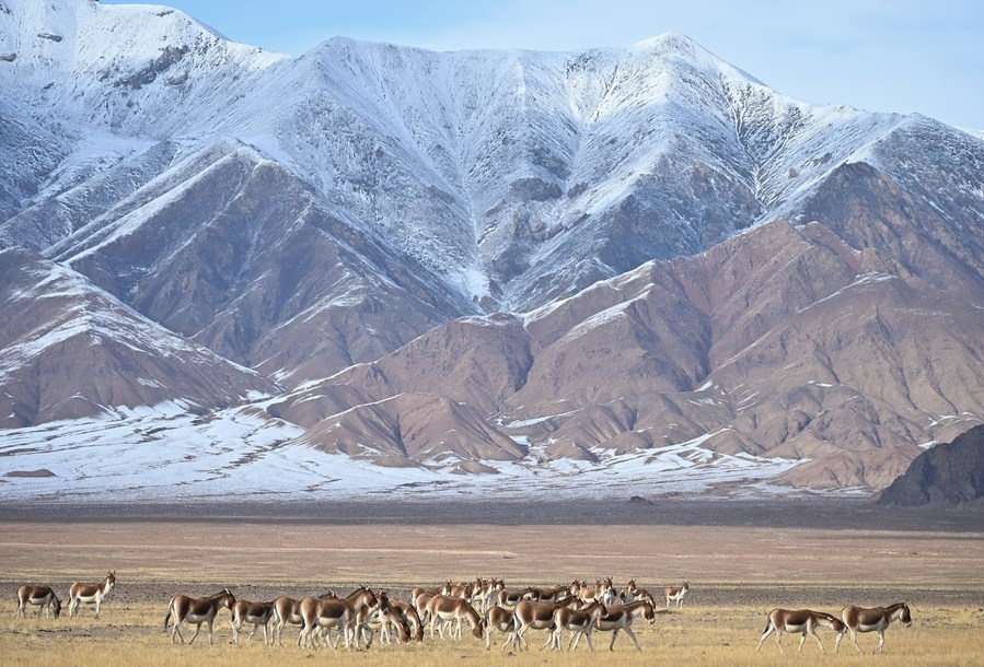 This photo taken on Oct. 16, 2023 shows Tibetan wild donkeys foraging on a grassland at the Altun Mountains National Nature Reserve in northwest China's Xinjiang Uygur Autonomous Region. (Xinhua/Li Xiang)