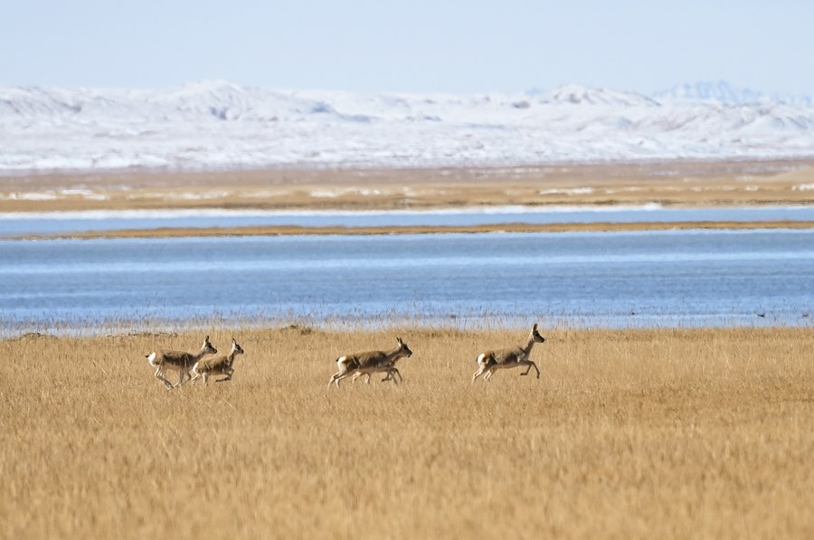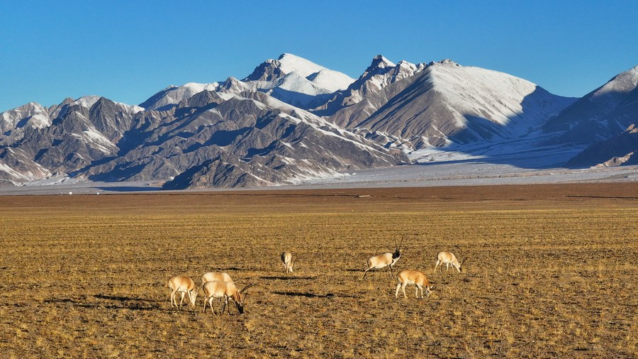 This photo taken on Oct. 18, 2023 shows Tibetan gazelles at the Altun Mountains National Nature Reserve in northwest China's Xinjiang Uygur Autonomous Region. (Xinhua/Li Xiang)