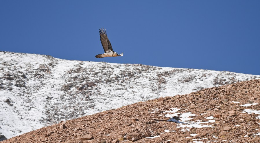 This photo taken on Oct. 18, 2023 shows a bearded vulture at the Altun Mountains National Nature Reserve in northwest China's Xinjiang Uygur Autonomous Region. (Xinhua/Li Xiang)