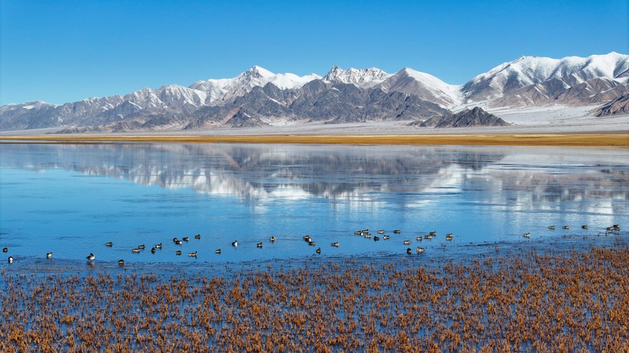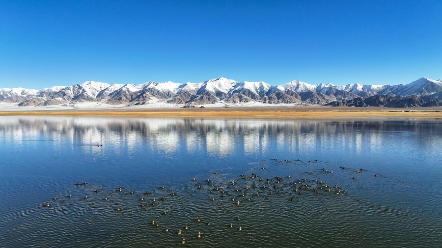 This aerial photo taken on Oct. 18, 2023 shows water birds resting on a lake at the Altun Mountains National Nature Reserve in northwest China's Xinjiang Uygur Autonomous Region. (Xinhua/Li Xiang)
