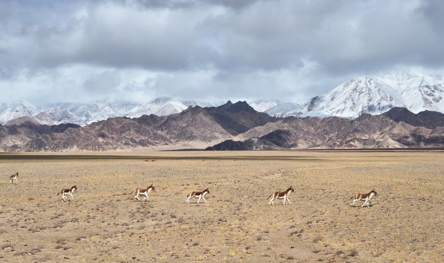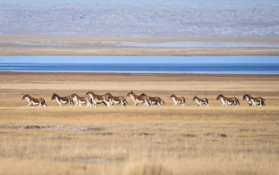 This photo taken on Oct. 18, 2023 shows Tibetan wild donkeys running on a grassland at the Altun Mountains National Nature Reserve in northwest China's Xinjiang Uygur Autonomous Region. (Xinhua/Li Xiang)