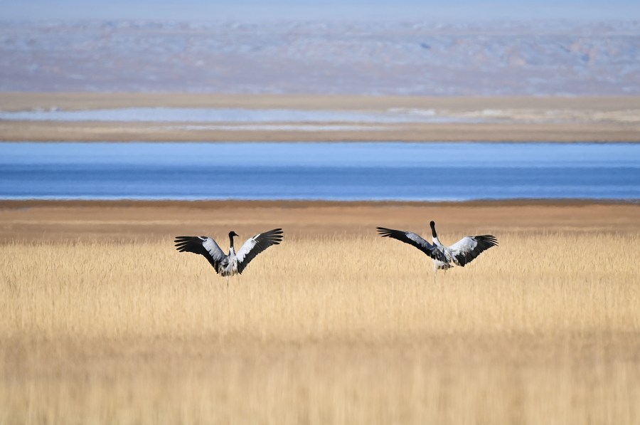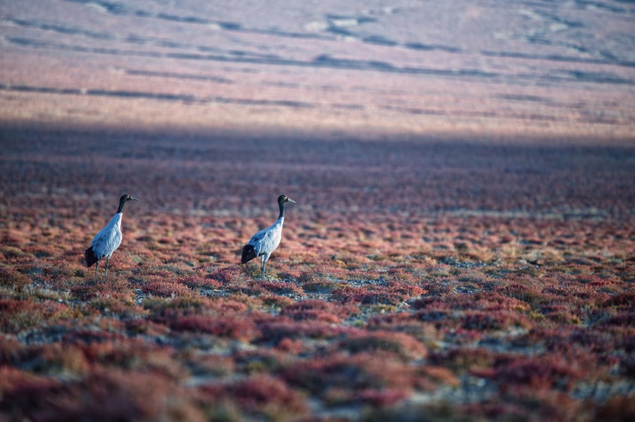 This photo taken on Oct. 18, 2023 shows black-necked cranes at the Altun Mountains National Nature Reserve in northwest China's Xinjiang Uygur Autonomous Region. (Xinhua/Li Xiang)
