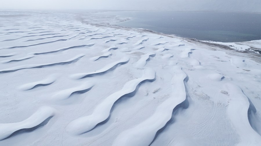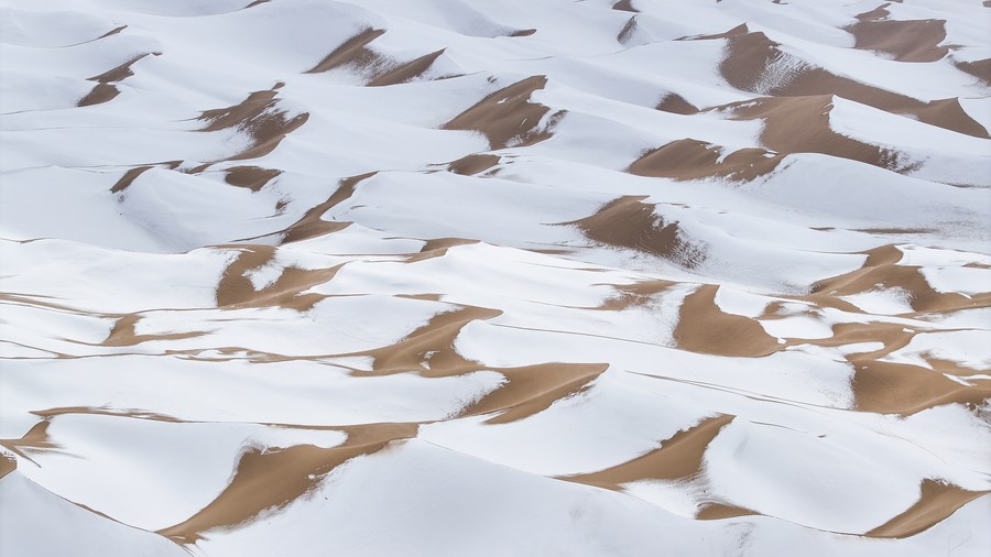 This aerial photo taken on Oct. 16, 2023 shows a snow-covered desert at the Altun Mountains National Nature Reserve in northwest China's Xinjiang Uygur Autonomous Region. (Xinhua/Li Xiang)