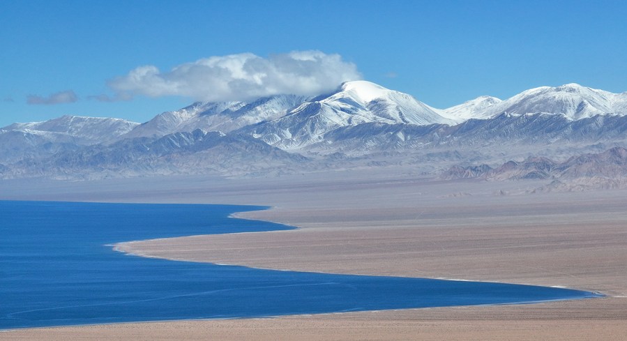 This aerial photo taken on Oct. 18, 2023 shows the Ayakum Lake and snow-covered mountains at the Altun Mountains National Nature Reserve in northwest China's Xinjiang Uygur Autonomous Region. (Xinhua/Li Xiang)
