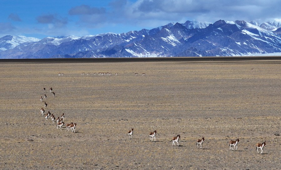 This aerial photo taken on Oct. 17, 2023 shows Tibetan wild donkeys running on a grassland at the Altun Mountains National Nature Reserve in northwest China's Xinjiang Uygur Autonomous Region. (Xinhua/Li Xiang)