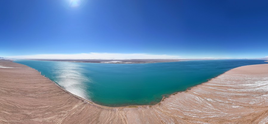 This aerial panoramic photo taken on Oct. 18, 2023 shows the Ayakum Lake at the Altun Mountains National Nature Reserve in northwest China's Xinjiang Uygur Autonomous Region. (Xinhua/Li Xiang)