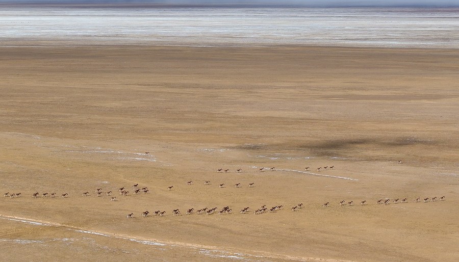 This aerial photo taken on Oct. 18, 2023 shows Tibetan antelopes foraging at the Altun Mountains National Nature Reserve in northwest China's Xinjiang Uygur Autonomous Region. (Xinhua/Li Xiang)
