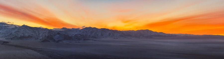 This aerial stitched photo taken on Oct. 17, 2023 shows the sunrise glow at the Altun Mountains National Nature Reserve in northwest China's Xinjiang Uygur Autonomous Region. (Xinhua/Li Xiang)■
