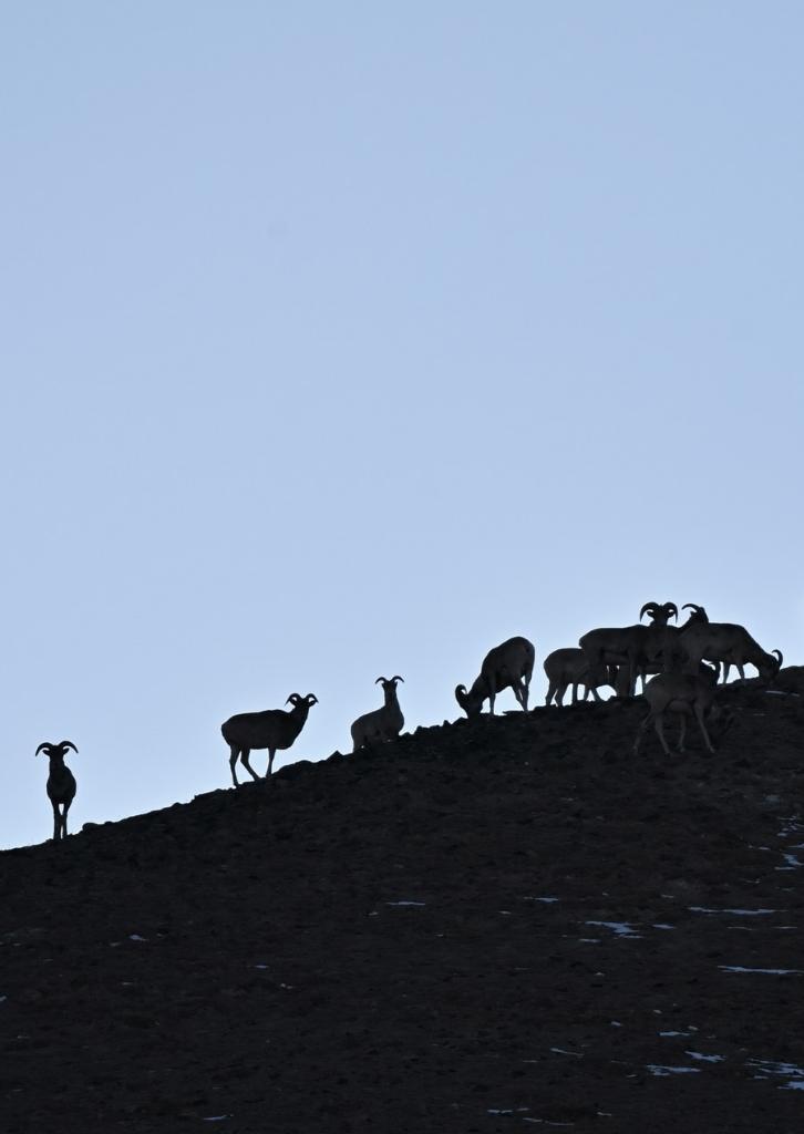 This photo taken on Oct. 15, 2023 shows blue sheep foraging on a hill at the Altun Mountains National Nature Reserve in northwest China's Xinjiang Uygur Autonomous Region. (Xinhua/Li Xiang)