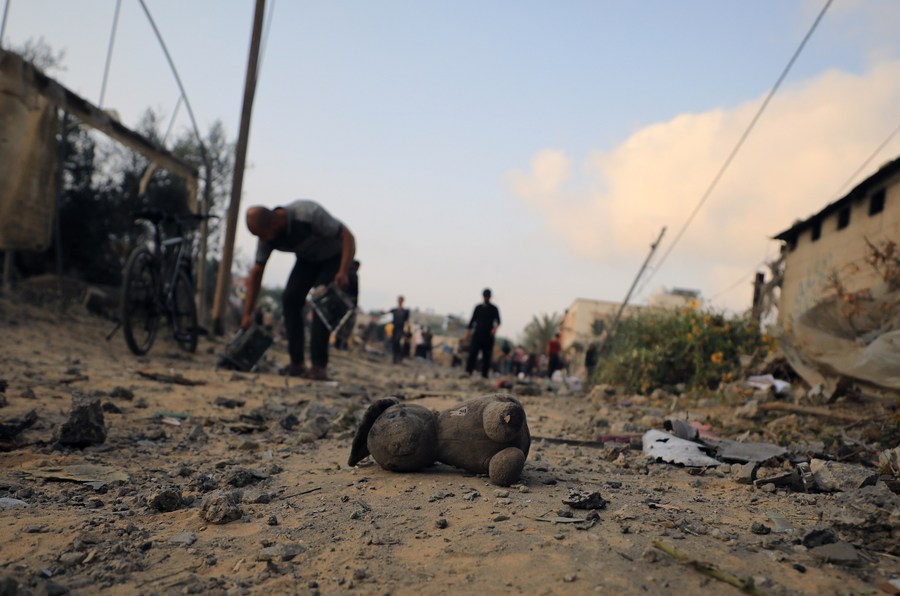 A toy is seen while people check buildings destroyed in Israeli airstrikes in the southern Gaza Strip city of Khan Younis, Oct. 23, 2023. The death toll of Palestinians from Israeli airstrikes on the Gaza Strip has risen to 5,087, the Hamas-run Health Ministry said on Monday. (Photo by Yasser Qudih/Xinhua)