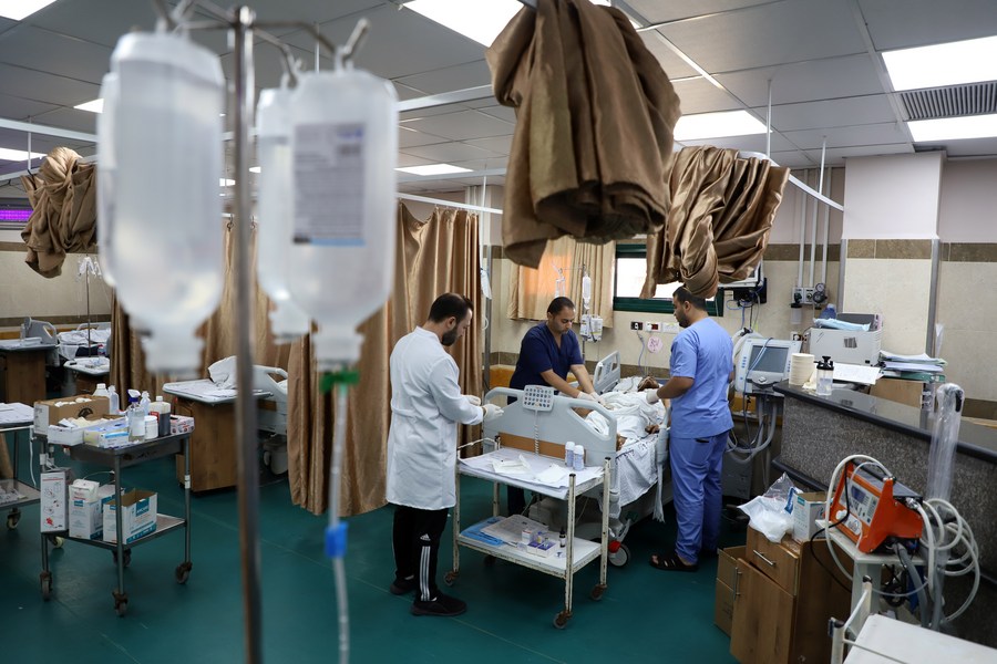 Medical workers treat an injured person inside Nasser Hospital to save the lives of citizens after Israeli airstrikes, in the center of the city of Khan Younis, south of the Gaza Strip, Oct. 22, 2023. (Photo by Rizek Abdeljawad/Xinhua)