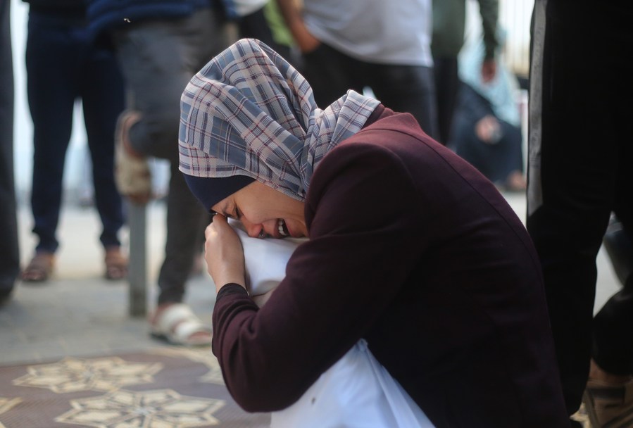 A woman mourns for her relative at a hospital in the southern Gaza Strip, Oct. 21, 2023. (Photo by Khaled Omar/Xinhua)