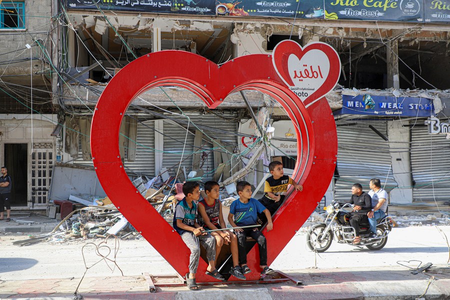 Children sit on a heart-shaped installation in front of a building destroyed in Israeli airstrikes in the southern Gaza Strip city of Khan Younis, Oct. 22, 2023. (Photo by Rizek Abdeljawad/Xinhua)