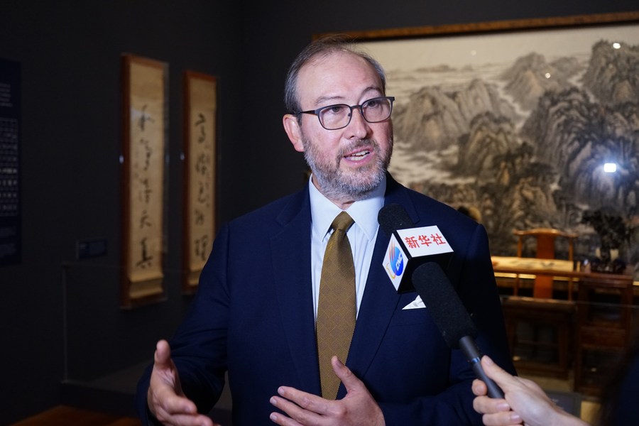 Seán O'Harrow, president and CEO of Bowers Museum, speaks during an interview at Bowers Museum in Orange County, Southern California, the United States, on Oct. 20, 2023. (Photo by Zeng Hui/Xinhua)