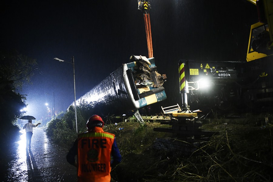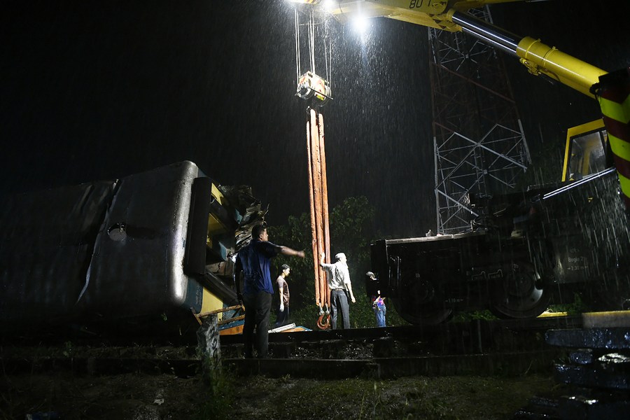 Rescuers work to lift a carriage overturned in a train collision in Kishoreganj district, Bangladesh, on Oct. 23, 2023. (Xinhua)