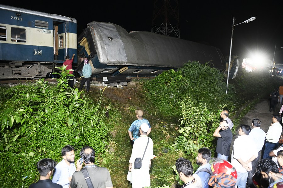People gather at the site of a train collision in Kishoreganj district, Bangladesh, on Oct. 23, 2023. (Xinhua)