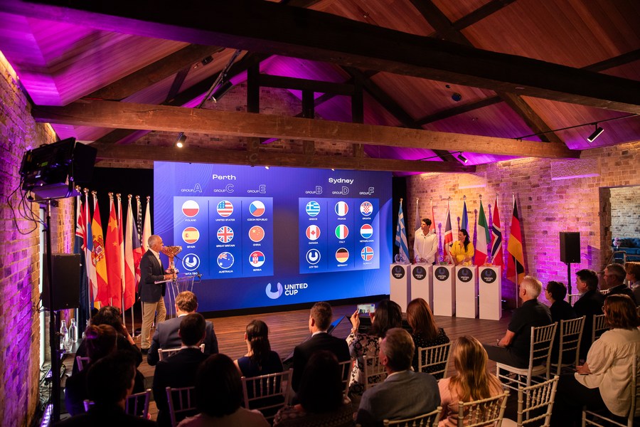 The result of draw is presented on the screen during the draw ceremony of 2023 United Cup tennis tournament in Sydney, Australia, Oct. 23, 2023. (Photo by Hu Jingchen/Xinhua)