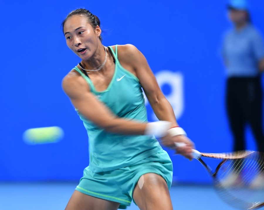 Zheng Qinwen returns the ball during the final match against Barbora Krejcikova of the Czech Republic at the WTA World Tour Zhengzhou Open in Zhengzhou, central China's Henan Province, Oct. 15, 2023. (Xinhua/Li Jianan)