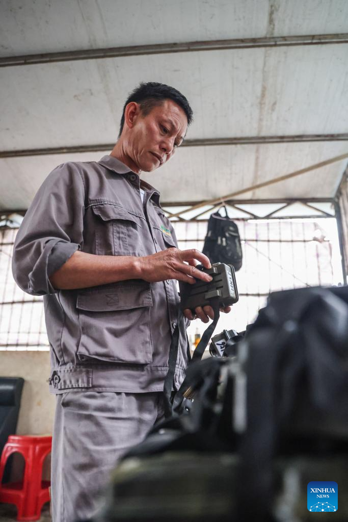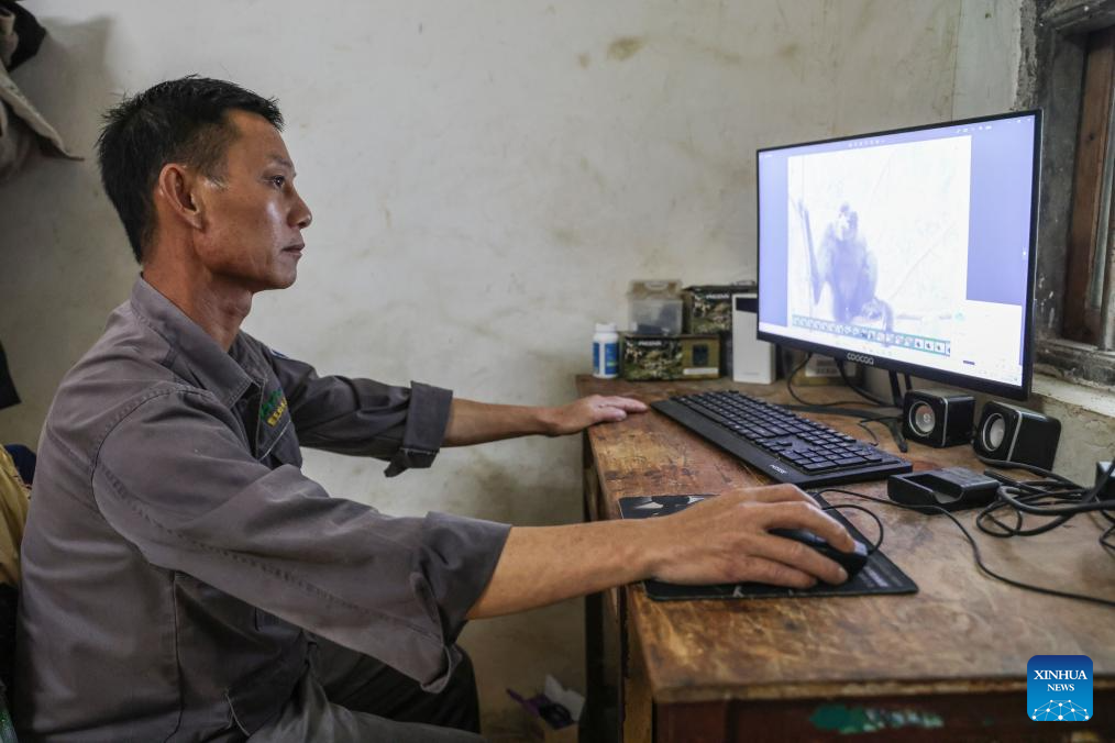 Li Wenyong checks an infrared camera at home in Baisha Li Autonomous County, south China's Hainan Province, Oct. 18, 2023. (Xinhua/Zhang Liyun)