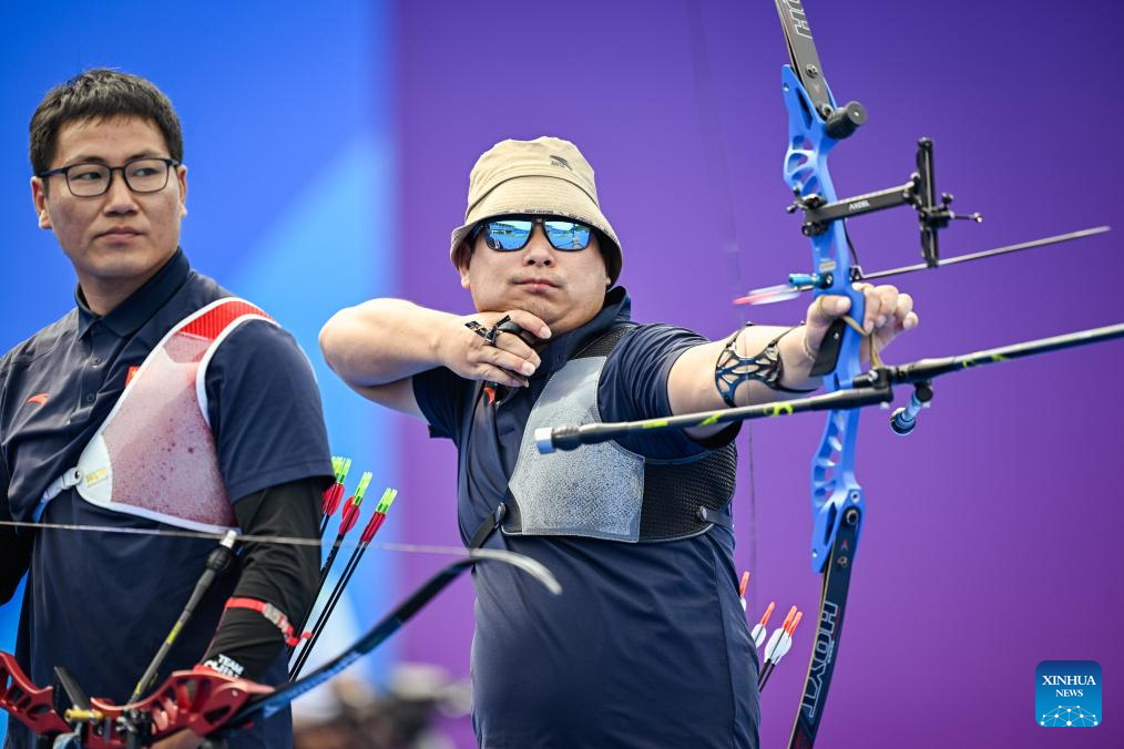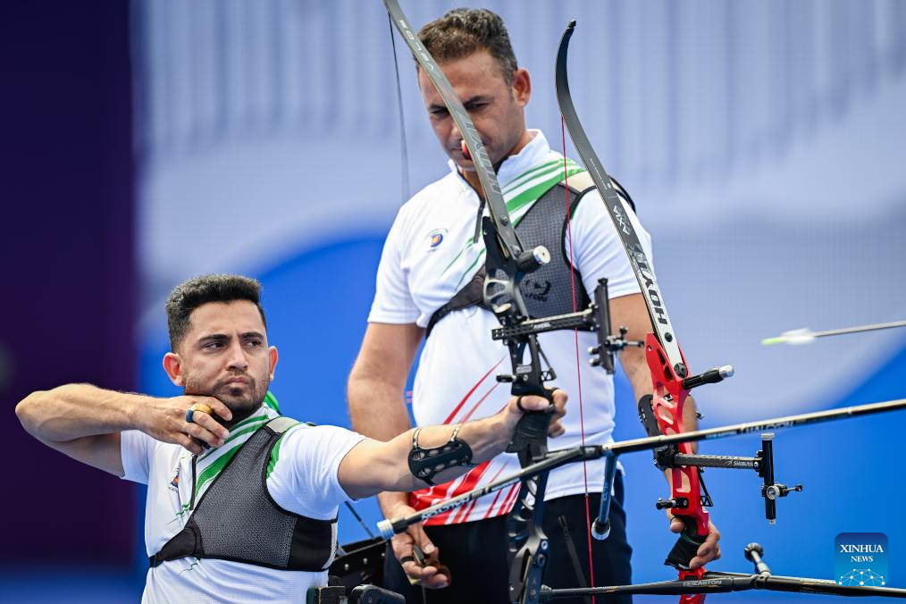 Mohammad Reza Arab Ameri (L) of Iran competes during the Men's Doubles Recurve Open Gold Medal Match of Archery between Gan Jun/Zhao Lixue of China and Mohammad Reza Arab Ameri/Gholamreza Rahimi of Iran at the 4th Asian Para Games in Hangzhou, east China's Zhejiang Province, Oct. 25, 2023. (Xinhua/Wu Zhizun)