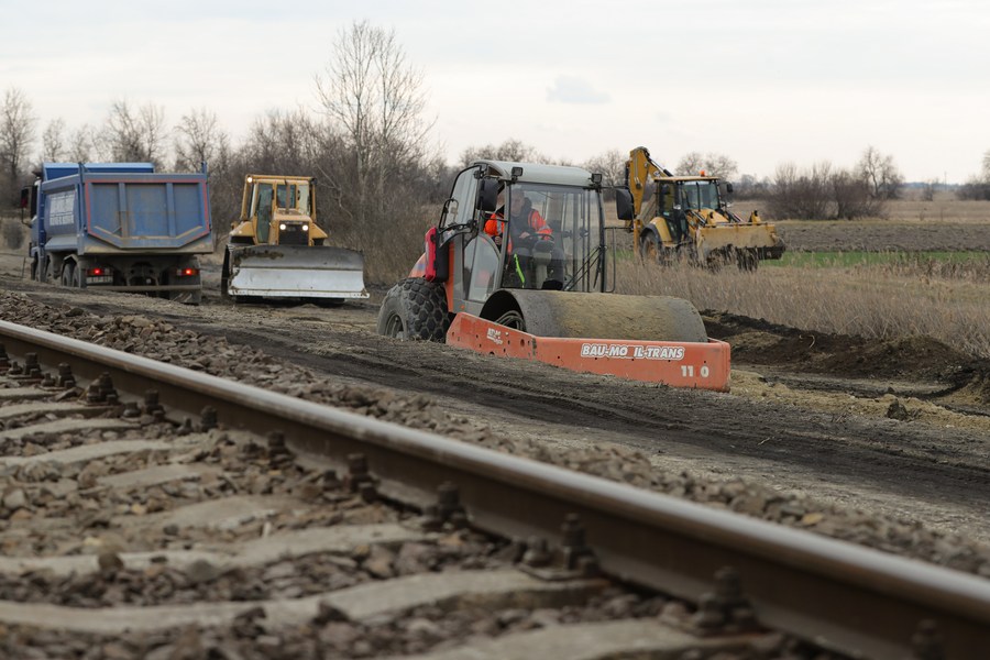 Engineering vehicles are seen at a construction site of Hungary-Serbia railway project in Delegyhaza, Hungary, Feb. 22, 2023. (Xinhua/Zheng Huansong)