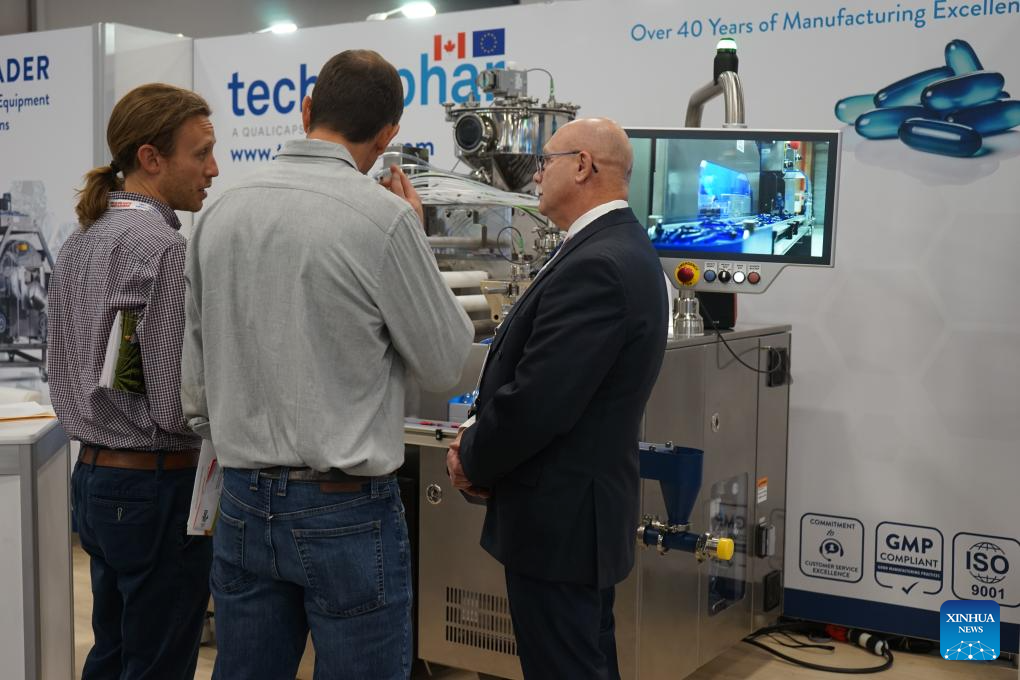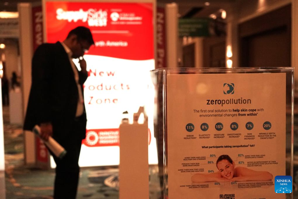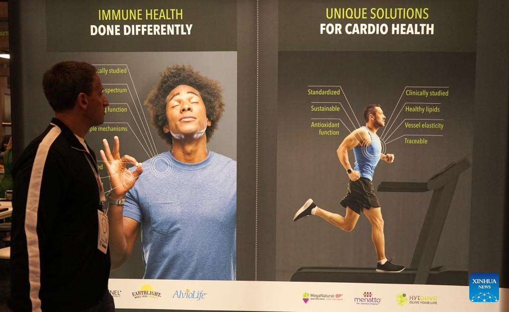 A man visits SupplySide West 2023 in Las Vegas, Nevada, the United States, on Oct. 25, 2023. SupplySide West 2023, one of the top conventions in the international healthcare ingredients industry, kicked off in Las Vegas on Wednesday. (Photo by Zeng Hui/Xinhua)