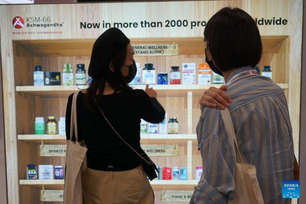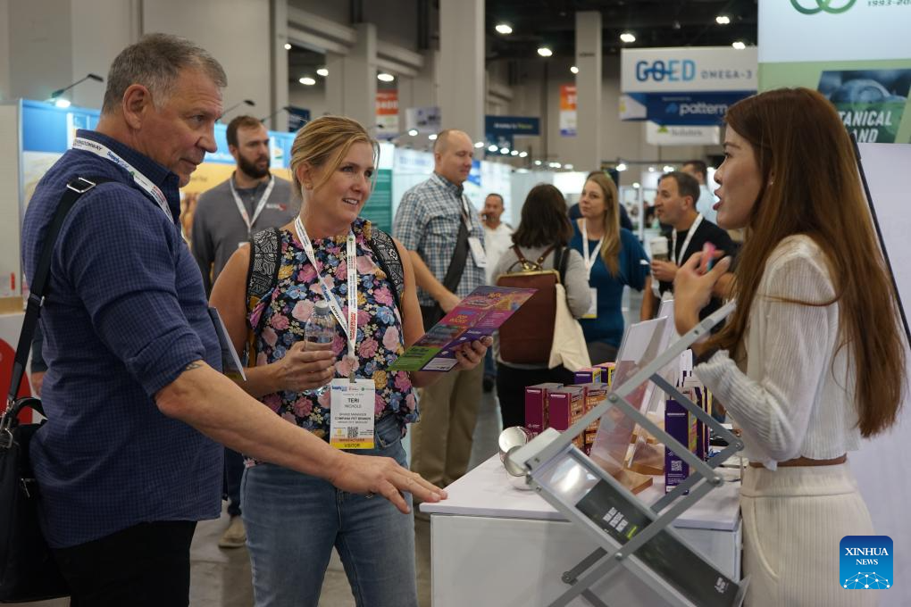 People visit SupplySide West 2023 in Las Vegas, Nevada, the United States, on Oct. 25, 2023. SupplySide West 2023, one of the top conventions in the international healthcare ingredients industry, kicked off in Las Vegas on Wednesday. (Photo by Zeng Hui/Xinhua)