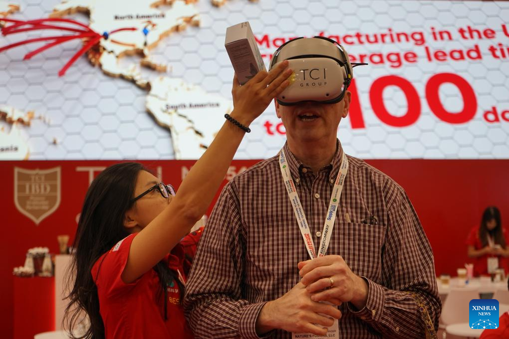 A man tries on VR glasses at SupplySide West 2023 in Las Vegas, Nevada, the United States, on Oct. 25, 2023. SupplySide West 2023, one of the top conventions in the international healthcare ingredients industry, kicked off in Las Vegas on Wednesday. (Photo by Zeng Hui/Xinhua)