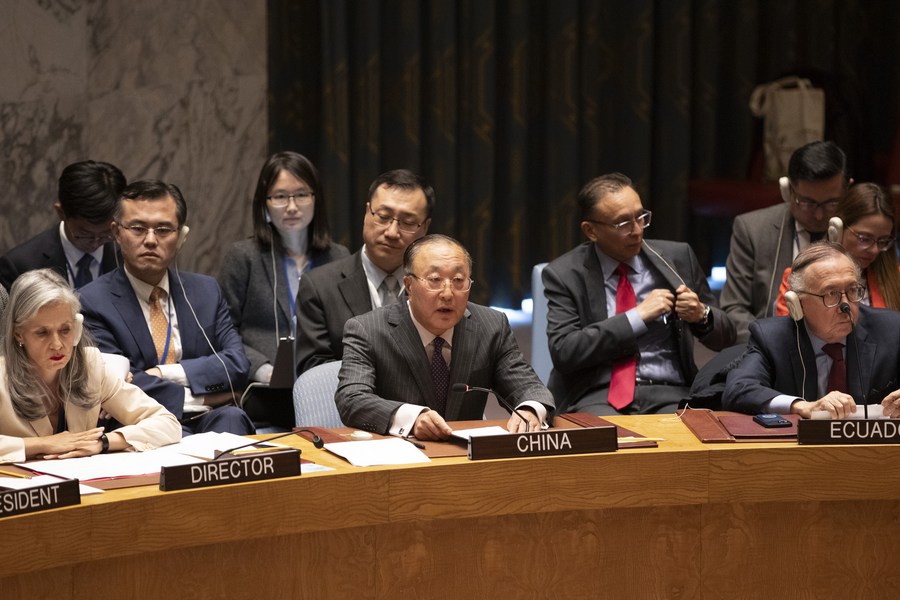 Zhang Jun (front and center), China's permanent representative to the United Nations, gives an explanation of the vote after the UN Security Council voting on a draft resolution regarding the conflict between Israel and Palestine at the UN headquarters in New York, on Oct. 25, 2023. (Xinhua/Xie E)
