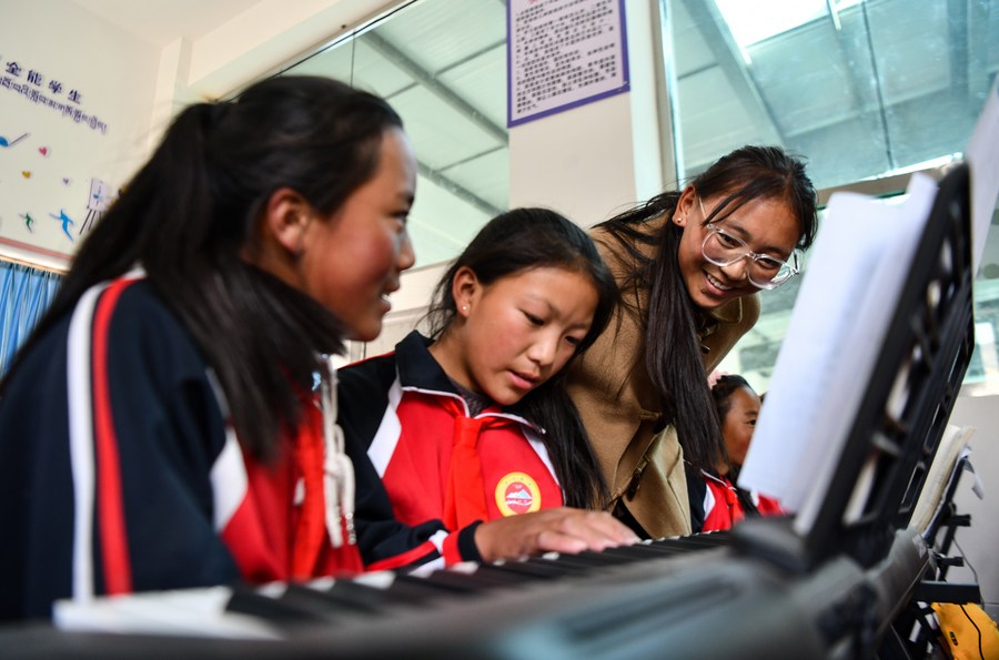 Piano teacher Basang (R) instructs students at a primary school of Zhaxizom Township in Tingri County, Xigaze City, southwest China's Xizang Autonomous Region, June 5, 2023. (Xinhua/Jigme Dorje)