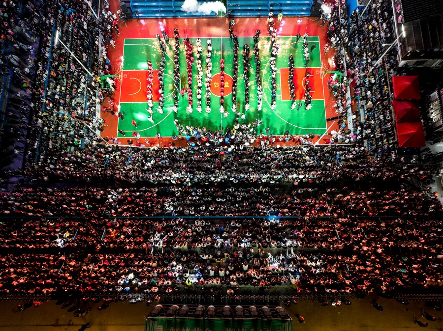 This aerial photo taken on Oct. 25, 2023 shows the opening ceremony of the finals of the Village Basketball Competition of China in Taipan Village of Taijiang County, southwest China's Guizhou Province. (Xinhua/Ou Dongqu)