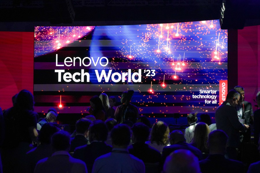 People participate in the Lenovo Tech World 2023 in Austin, Texas, the United States, Oct. 24, 2023. Computer giant Lenovo Group unveiled a comprehensive vision of "AI for All" at its Tech World 2023 conference on Tuesday in Austin, Texas, while deepening cooperation with its key global partners. (Photo by Li Bo/Xinhua)■