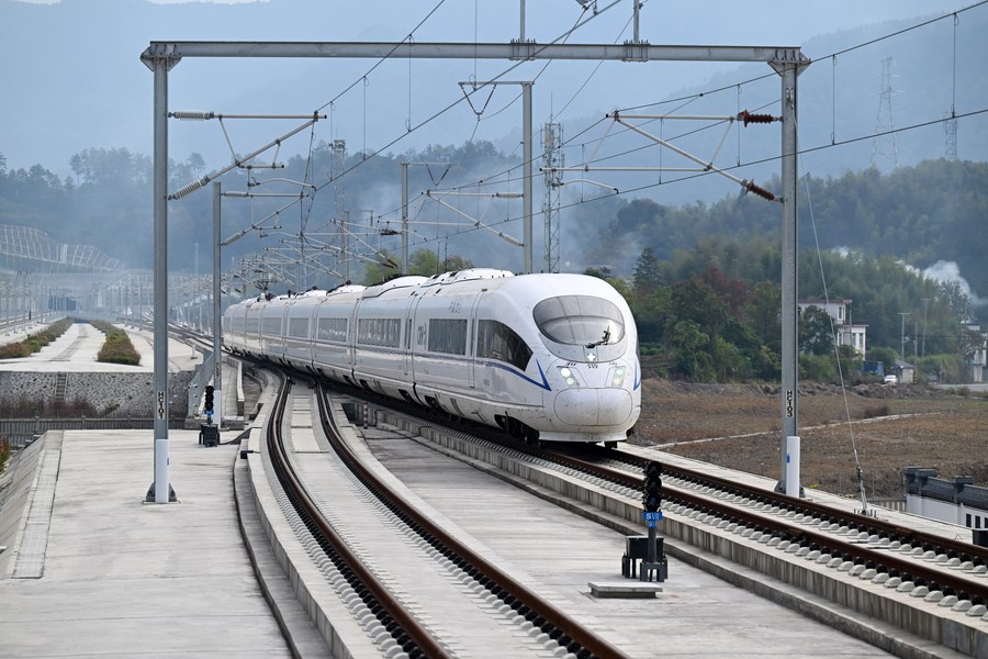 This photo taken on Oct. 26, 2023 shows a test train running on the Nanchang-Jingdezhen-Huangshan high-speed railway in east China's Anhui Province. (Xinhua/Zhou Mu)