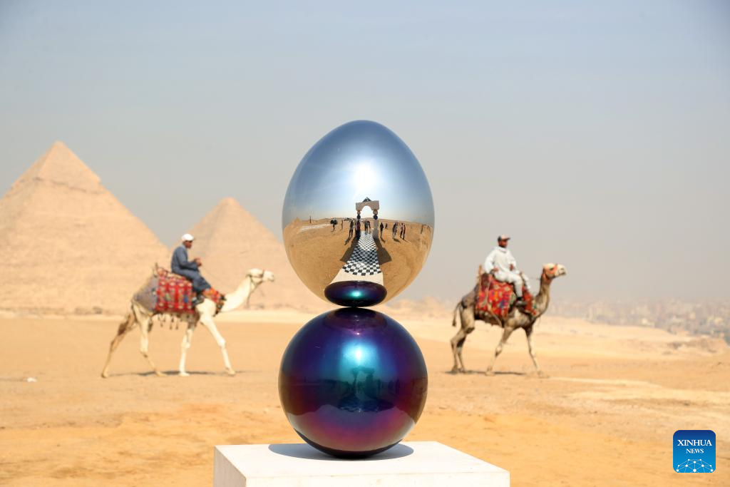 This photo taken on Oct. 26, 2023 shows an artwork exhibited during the "Forever Is Now" international art exhibition at Giza Pyramids scenic spot in Giza, Egypt. With the participation of 14 international artists, the exhibition "Forever Is Now" was launched on Thursday in the area of Egypt's Pyramids of Giza and the surrounding plateau. The exhibition runs from Oct. 26 to Nov. 18. (Xinhua/Ahmed Gomaa)