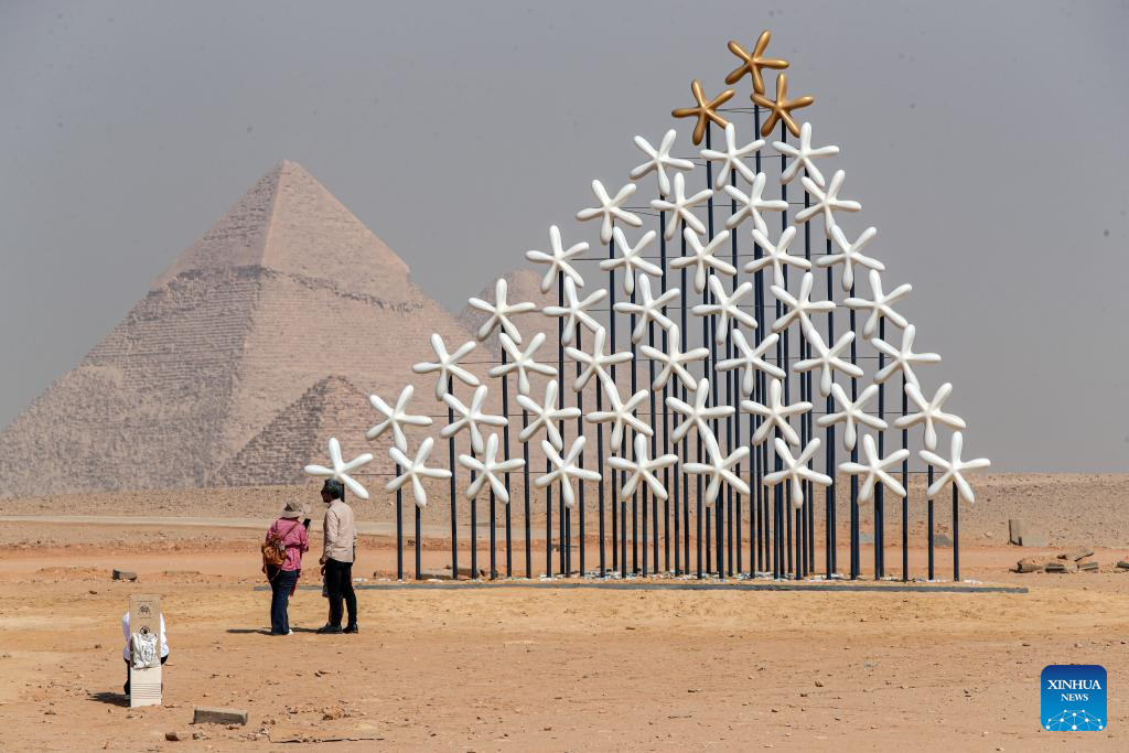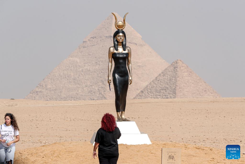 Visitors view an artwork exhibited during the "Forever Is Now" international art exhibition at Giza Pyramids scenic spot in Giza, Egypt, Oct. 26, 2023. With the participation of 14 international artists, the exhibition "Forever Is Now" was launched on Thursday in the area of Egypt's Pyramids of Giza and the surrounding plateau. The exhibition runs from Oct. 26 to Nov. 18. (Xinhua/Ahmed Gomaa)