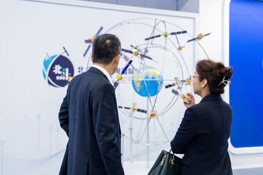 Visitors look at an exhibit during the second International Summit on BeiDou Navigation Satellite System (BDS) Applications in Zhuzhou, central China's Hunan Province, Oct. 26, 2023. (Xinhua/Chen Sihan)