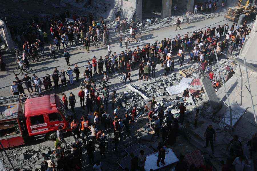 People inspect the damages after Israeli airstrikes in the southern Gaza Strip city of Rafah, on Oct. 26, 2023. (Photo by Khaled Omar/Xinhua)