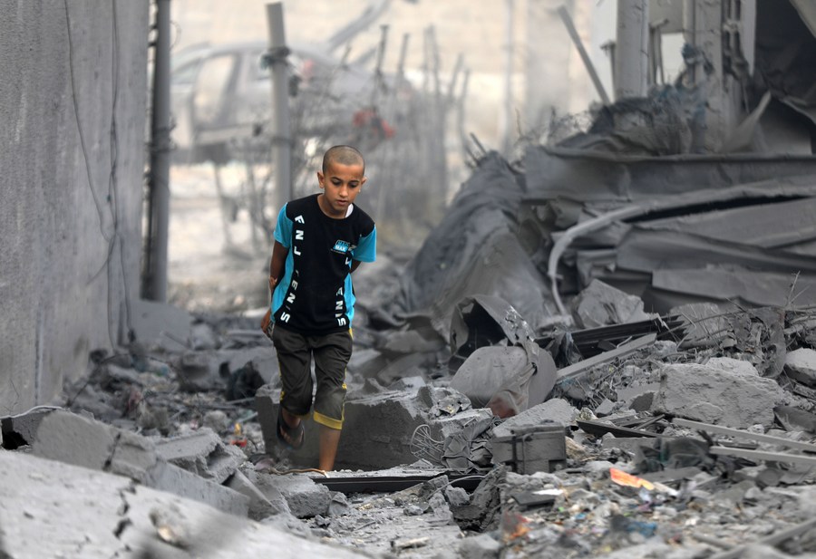 A Palestinian boy walks amid the rubble of destroyed buildings after Israeli airstrikes in the southern Gaza Strip city of Khan Younis, Oct. 25, 2023. (Photo by Yasser Qudih/Xinhua)■