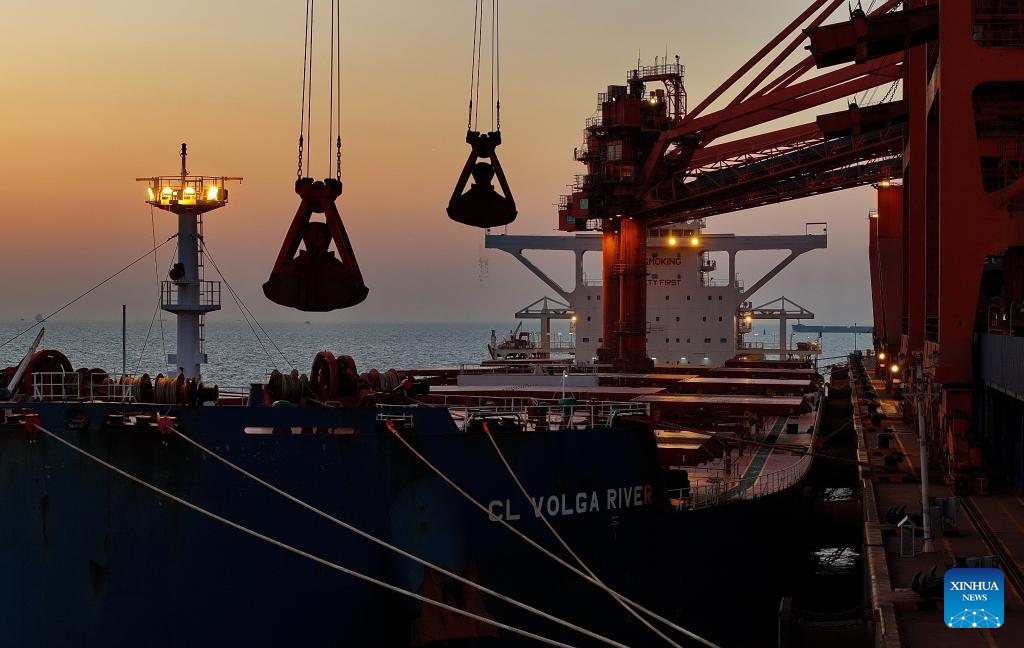 This aerial photo taken on Oct. 27, 2023 shows a ship unloading cargo at the ore wharf of the Caofeidian port area of the Tangshan Port in north China's Hebei Province. The cargo throughput of Tangshan Port reached 619.87 million tonnes from January to September this year, up 9.3 percent year on year. (Xinhua/Yang Shiyao)