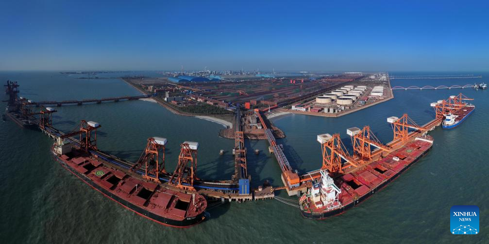 This aerial photo taken on Oct. 27, 2023 shows ships unloading cargo at the ore wharf of the Caofeidian port area of the Tangshan Port in north China's Hebei Province. The cargo throughput of Tangshan Port reached 619.87 million tonnes from January to September this year, up 9.3 percent year on year. (Xinhua/Yang Shiyao)