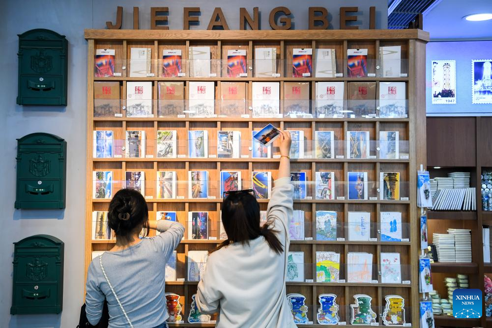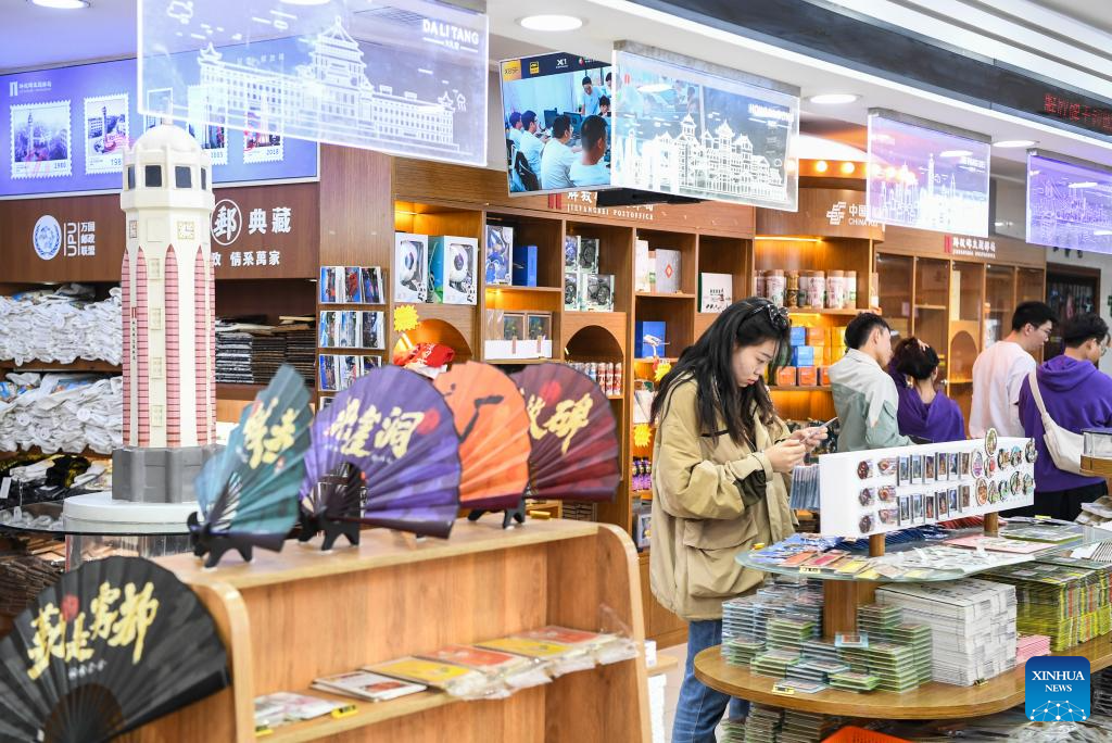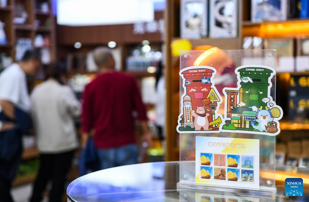 Tourists visit a post office on Duyou Street in southwest China's Chongqing Oct. 29, 2023. Duyou Street, an ancient street named after a postal service administration in the Qing Dynasty (1644-1911), has been renovated into a popular tourist destination featuring postal culture. (Xinhua/Wang Quanchao)