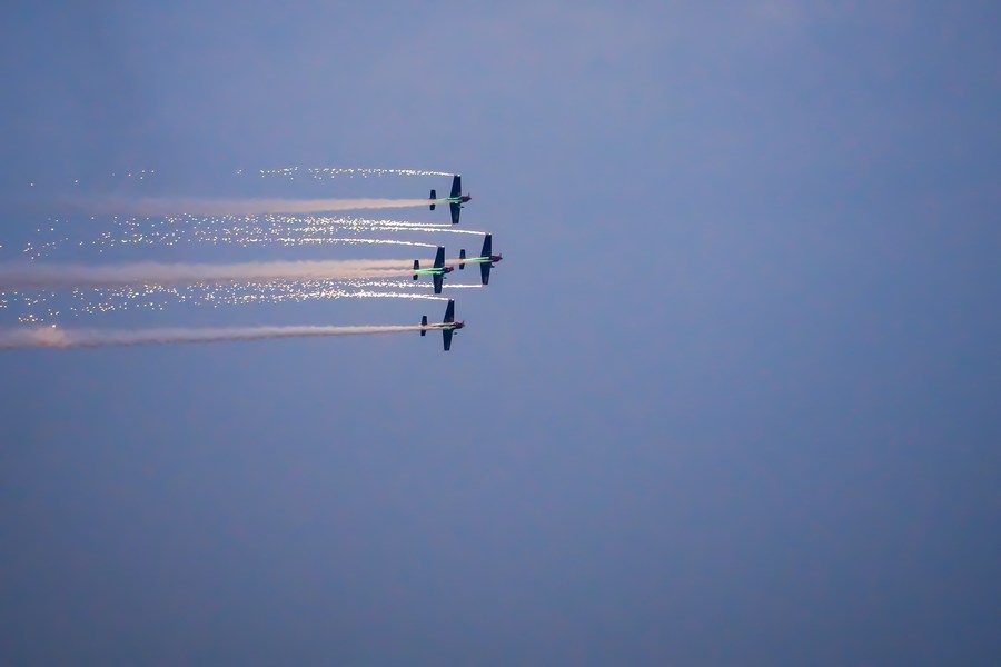 During the daytime, the Pioneer Team made colorful patterns in the sky with trails of smoke. At sunset, the team set off flash bombs and wing fireworks to make the show more spectacular. Their performance this year prompted cheers and applause from the crowd.