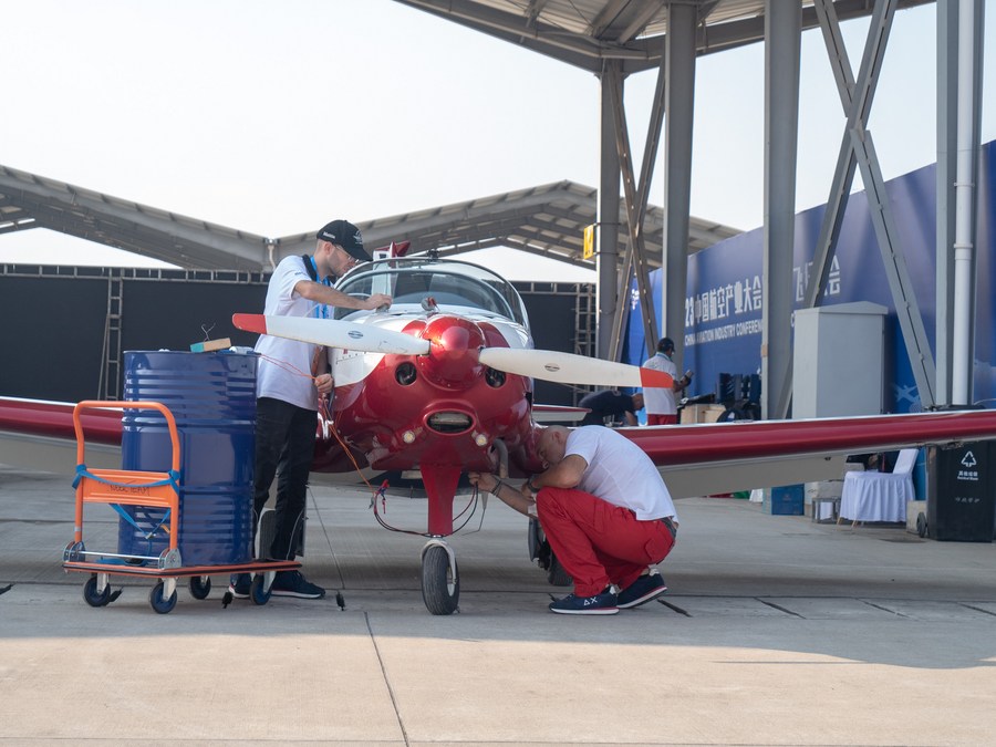 Members of the Pioneer Team checks a plane in Nanchang, east China's Jiangxi Province, Oct. 26, 2023. (Xinhua/Guo Jiewen)