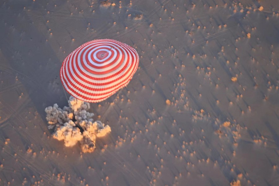 The return capsule of the Shenzhou-16 manned spaceship touches down at the Dongfeng landing site in north China's Inner Mongolia Autonomous Region, Oct. 31, 2023. (Xinhua/Li Gang)