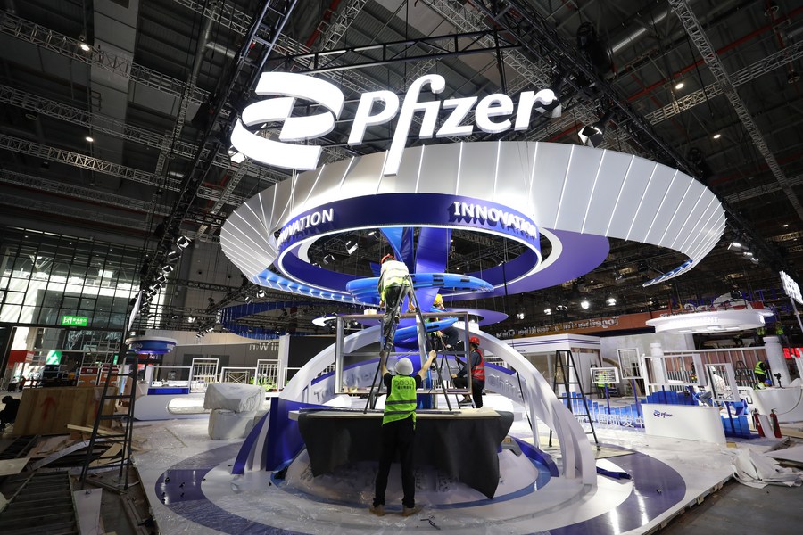 Workers set up an exhibition area at the National Exhibition and Convention Center (Shanghai), the main venue for the upcoming sixth China International Import Expo (CIIE), in east China's Shanghai, Oct. 29, 2023. The sixth CIIE is scheduled to take place in Shanghai from Nov. 5 to Nov. 10. (Xinhua/Ding Ting)