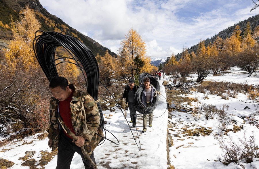 Workers carrying optical fibers walk in snow-covered field to build a 5G base station for Majiagou scenic spot in Xiaojin County, southwest Chinas Sichuan Province, Oct. 29, 2023. (Xinhua/Jiang Hongjing)