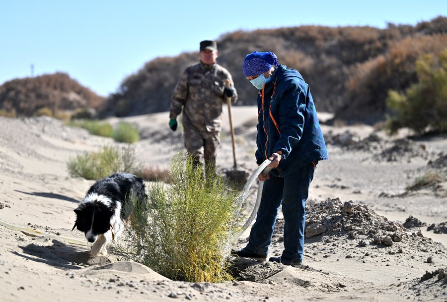 Delg waters a Haloxylon plant in Ejina Banner of Alxa League, north China's Inner Mongolia Autonomous Region, Oct. 28, 2023. Su He, dubbed a "role model of the times," was a retired cadre living near the Heicheng relic site, a well preserved ancient city on the Silk Road, in Ejina Banner. Su and her wife Delg planted a Haloxylon forest covering 3,500 mu (about 233.33 hectares) from 2004 to 2021, which still serves as an ecological shield against sandstorms to the Heicheng relic site. Delg and their son stayed to take care of and expand the Haloxylon forest after Su's passing in 2021. Bungalows built by Su and Delg when they initially took root in the desert in 2004 still stand there, but are now flanked by trees. The Su family chose to keep composing an ode to life and green in this rarely visited area of desert. (Xinhua/Ren Junchuan)