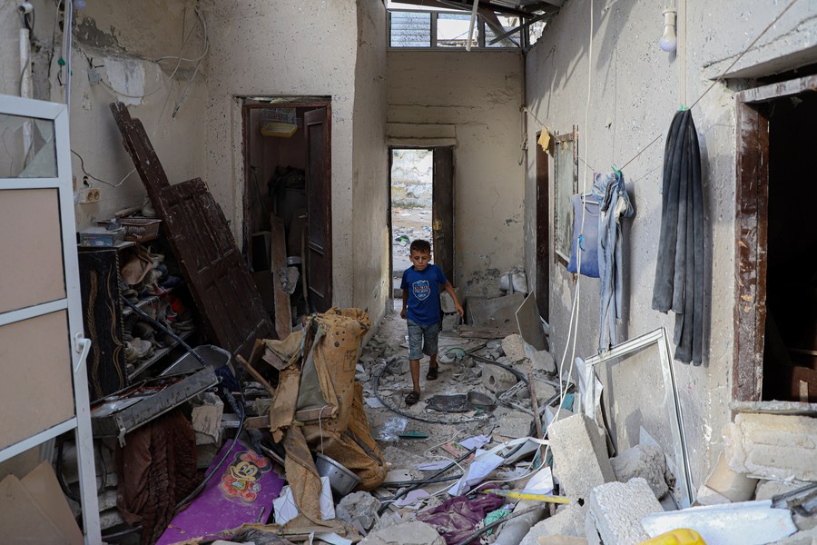 A boy is seen among the rubble of buildings destroyed in Israeli airstrikes in the southern Gaza Strip city of Khan Younis Oct. 29, 2023. (Photo by Rizek Abdeljawad/Xinhua)