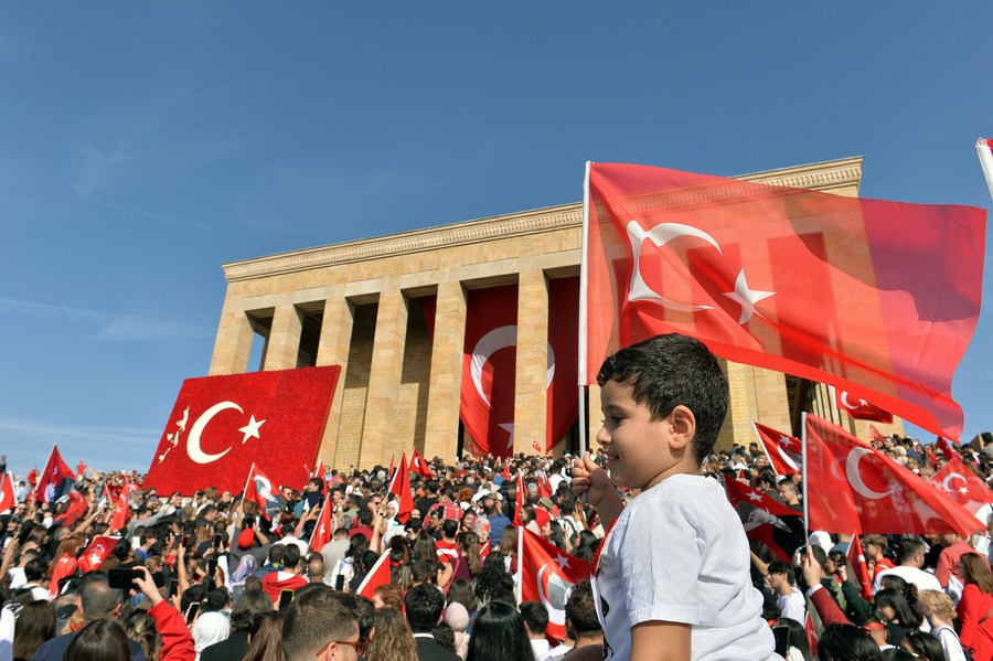 People participate in celebrations marking the 100th anniversary of the establishment of the Republic of Türkiye in Ankara, Türkiye, Oct. 29, 2023. (Mustafa Kaya/Handout via Xinhua)